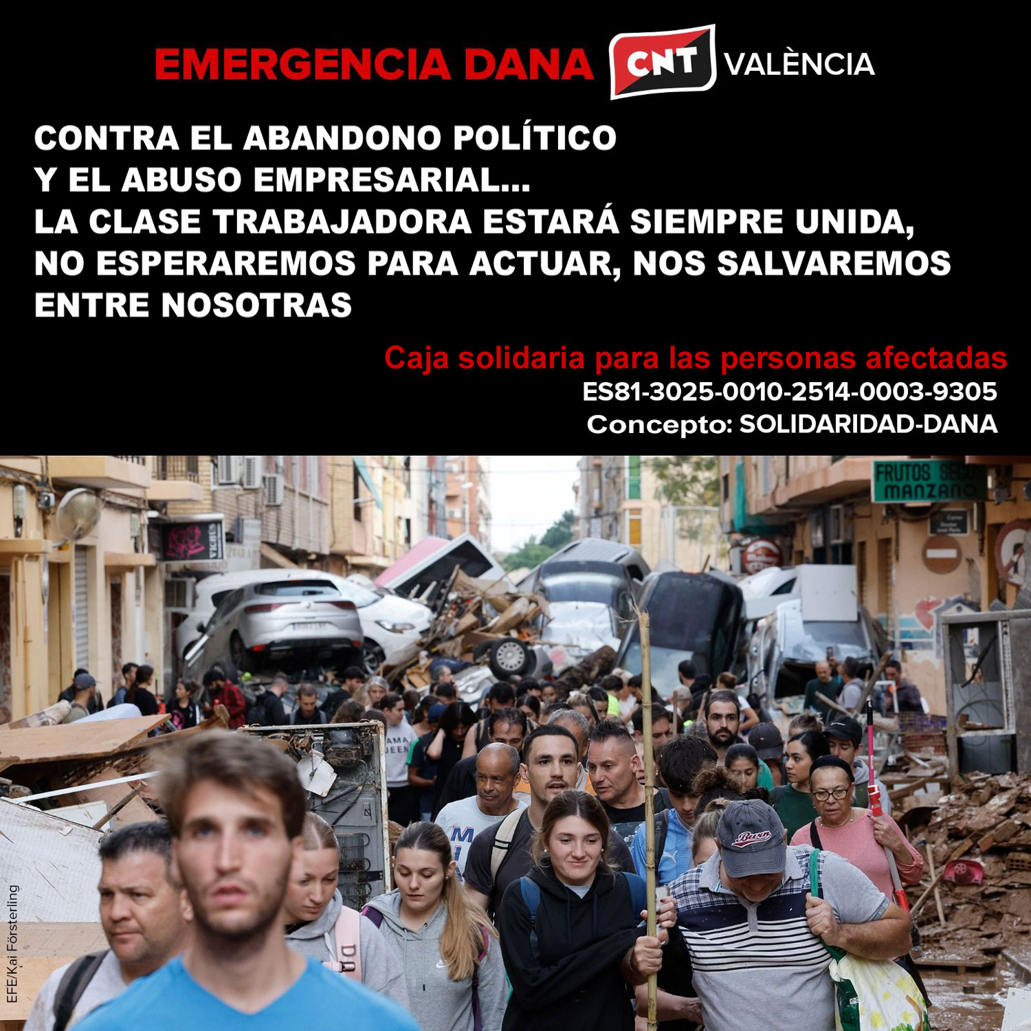 Frente al abandono político y contra el abuso empresarial…  la clase trabajadora estamos siempre unida, no esperamos para actuar y nos salvamos entre nosotras. Para hacer frente a los desastres generados por la DANA en València, CNT ha puesto en marcha una caja solidaria para ayudar a las personas afectadas. Os animamos a apoyarla en la medida de las posibilidades de cada una.