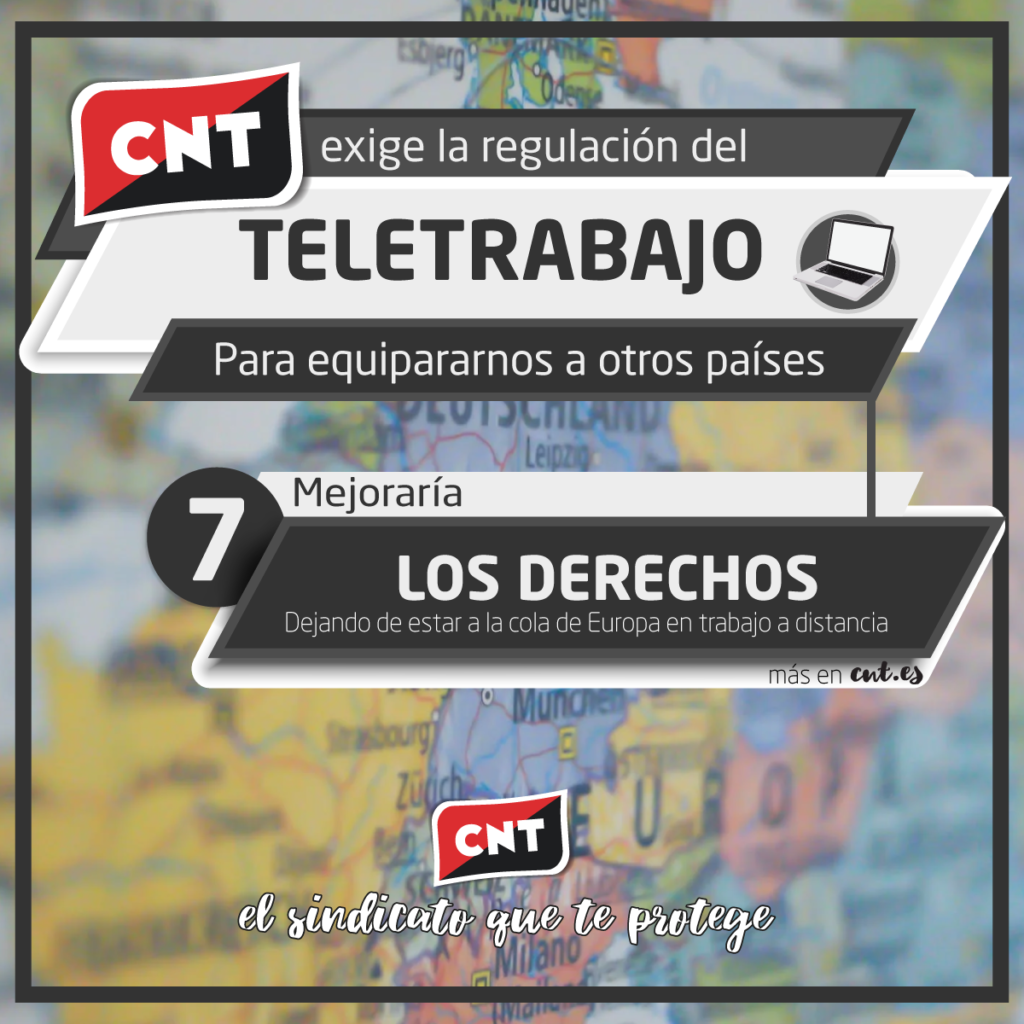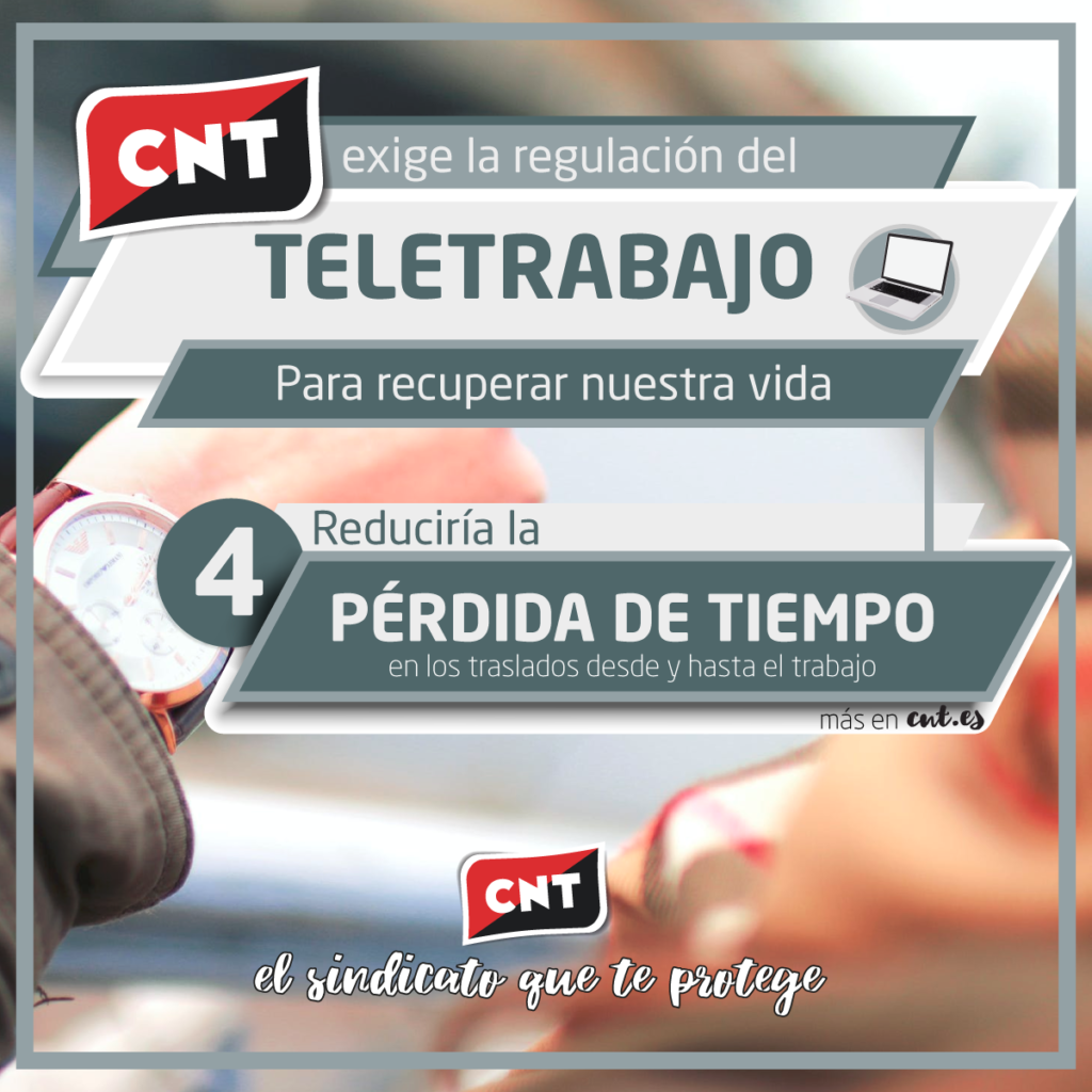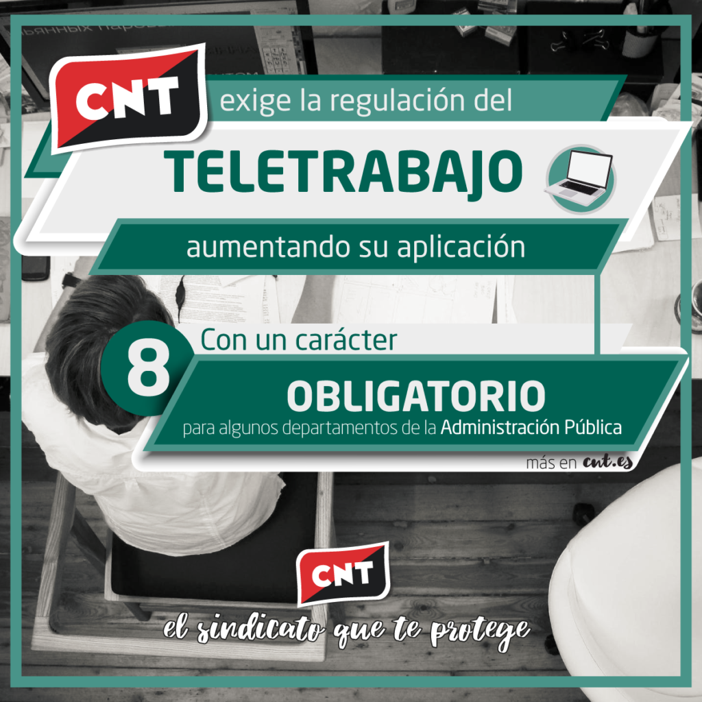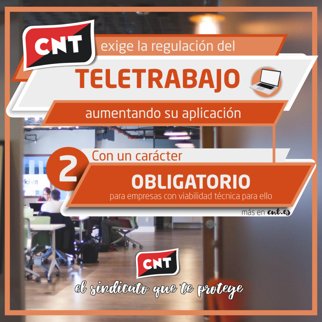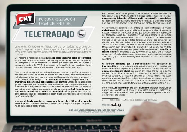 Por todo ello, CNT ha remitido una carta al Gobierno exigiendo una regulación urgente que solvente la situación de inseguridad jurídica y establezca las obligaciones de las empresas para implementar el teletrabajo en los términos que reivindica el sindicato.