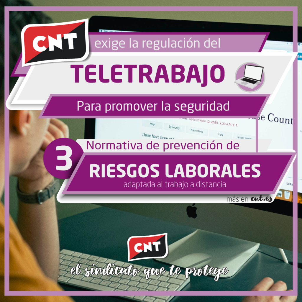 CNT reivindica que se legisle cuanto antes para que el teletrabajo se devenga obligatorio en los sectores de actividad en los que sea posible técnicamente. Existen multitud de actividades en las que tradicionalmente el desempeño del teletrabajo habría sido impensable y que, ahora mismo, se encuentran utilizándolo como consecuencia del COVID19. Las empresas que se encuentren incluidas en los sectores delimitados, tendrían un breve plazo para dotar a su plantilla del conjunto de medios técnicos necesarios para el trabajo a distancia -en particular, los ligados a las comunicaciones- en cumplimiento del Acuerdo Marco Europeo sobre el Teletrabajo del 16/07/2002. CNT reclama que en dicha regulación se tengan también muy presentes las cuestiones de prevención de riesgos laborales, mejorando la Ley de Prevención de 1995, con la finalidad de proteger más aún a las personas trabajadoras que desempeñan su trabajo a distancia y que -durante la emergencia- dependen de una autoevaluación voluntaria.