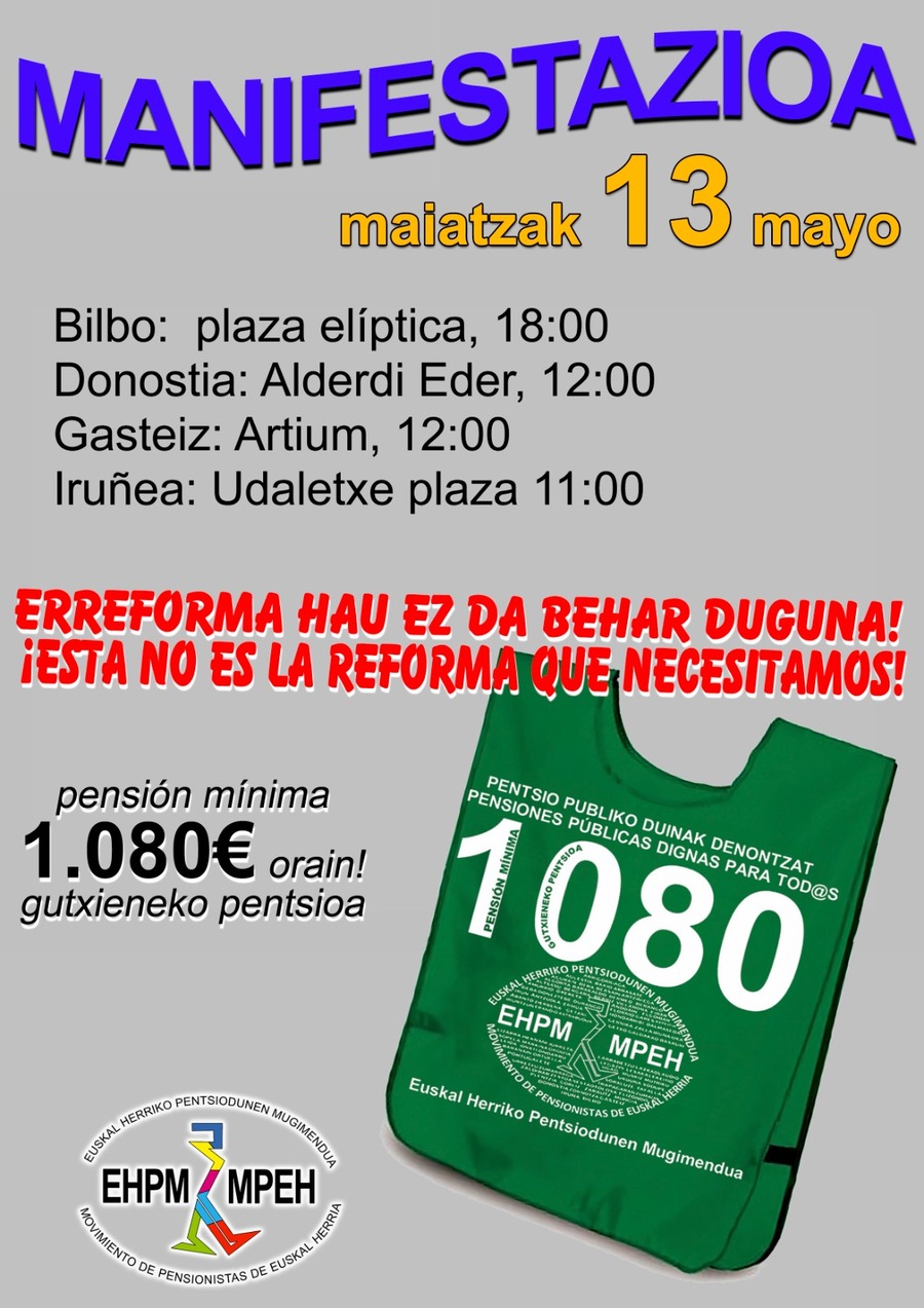 - El Movimiento de Pensionistas de Euskal Herria llama a participar en las manifestaciones convocadas para el 13 de mayo