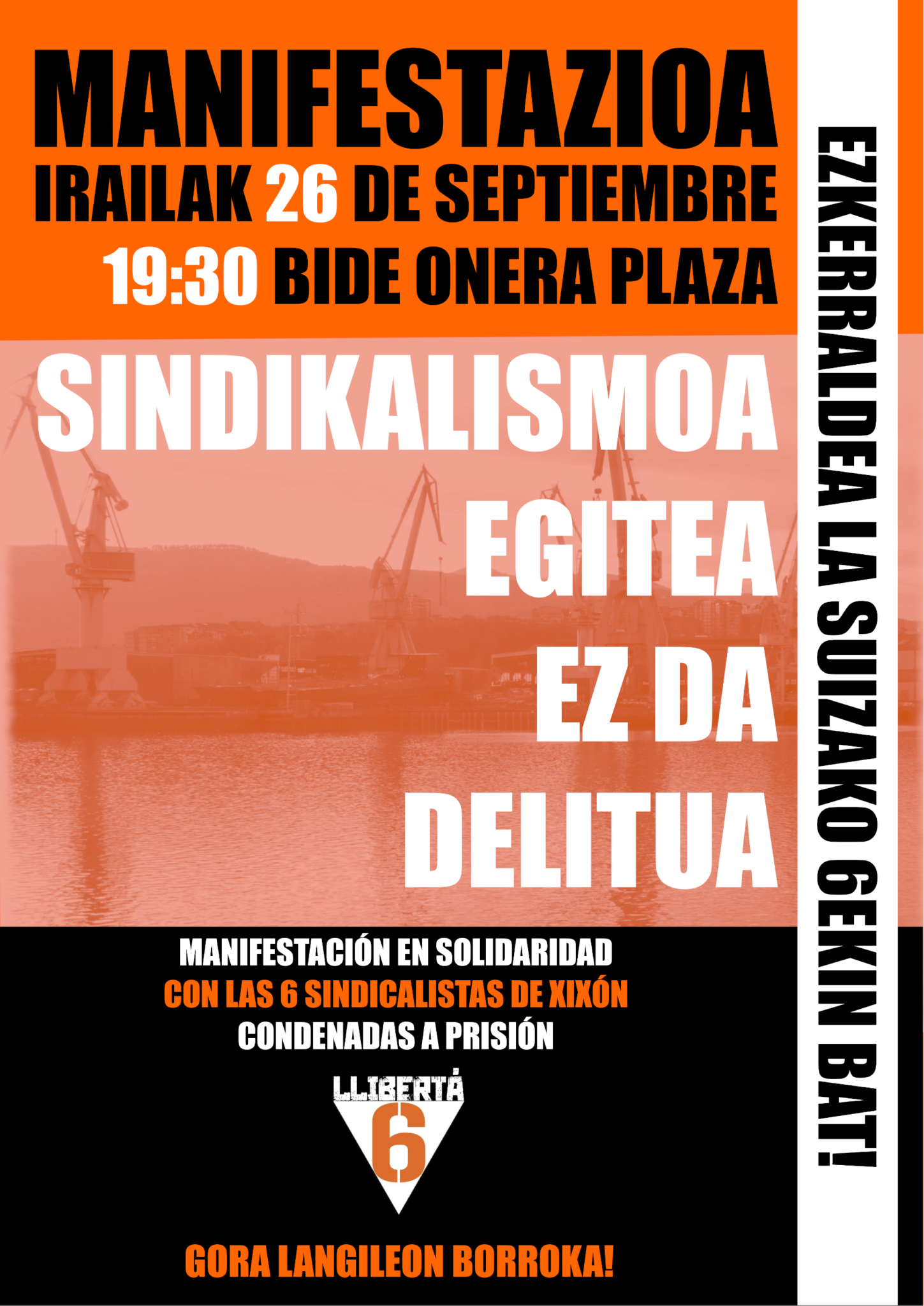 Bajo el lema «Ezkerraldea La Suizako 6ekin bat! Gora langileon borroka!», la manifestación se celebrará el 26 de septiembre a las 19:30 horas. Los convocantes han hecho un llamamiento a la ciudadanía y a los movimientos sociales para que muestren su solidaridad y rechazo a lo que consideran un claro ejemplo de represión sindical.