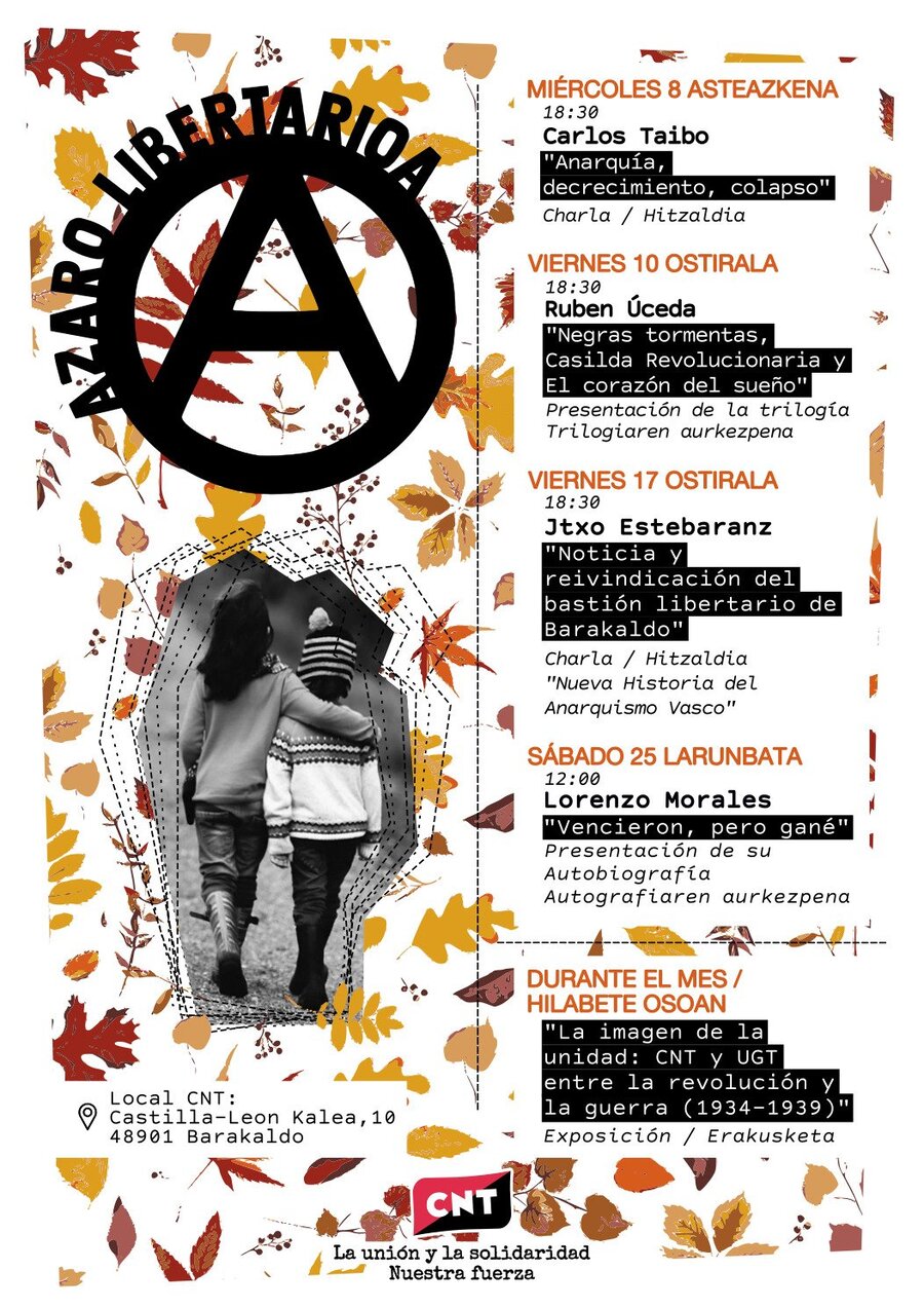 La apertura de las jornadas la realizará Carlos Taibo, con la sesión «Anarquía, decrecimiento y colapso», que será el miércoles 8 de noviembre. El viernes 10, Rubén Úceda, historietista y dibujante de cómics presentará su triología de obras «Negras Tormentas, Casilda revolucionaria y El corazón del sueño». El siguiente viernes, el 17 de noviembre, el historiador Jtxo. Estebaranz realizará una charla, «Noticia y reivindicación del bastión libertario de Barakaldo». Todas estás charlas y presentaciones serán a las 18:30 de la tarde.