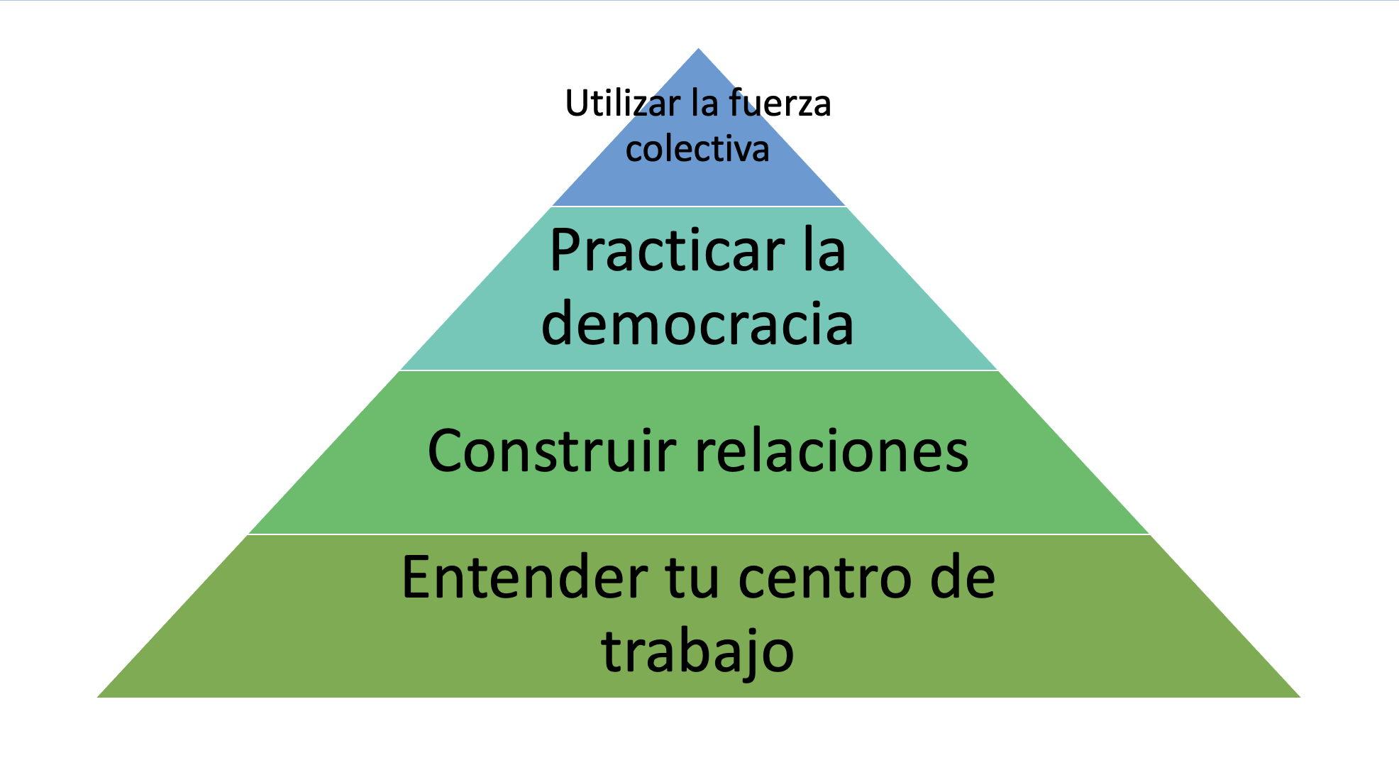 Cualquiera que haya asistido a la Formación de Organizadores 101 de la IWW estará familiarizado con la «pirámide» organizativa que compartimos allí. Si no la has visto, o necesitas un repaso, es bastante sencilla; muestra un punto concreto de acción directa construido sobre una base más amplia de práctica de la democracia en el centro de trabajo (por ejemplo, reuniones), que se construye sobre las relaciones en el centro de trabajo (construidas a través de encuentros individuales), todo lo cual descansa sobre una base más amplia de «conocimiento de tu centro de trabajo» (listas, mapeo, etc.).