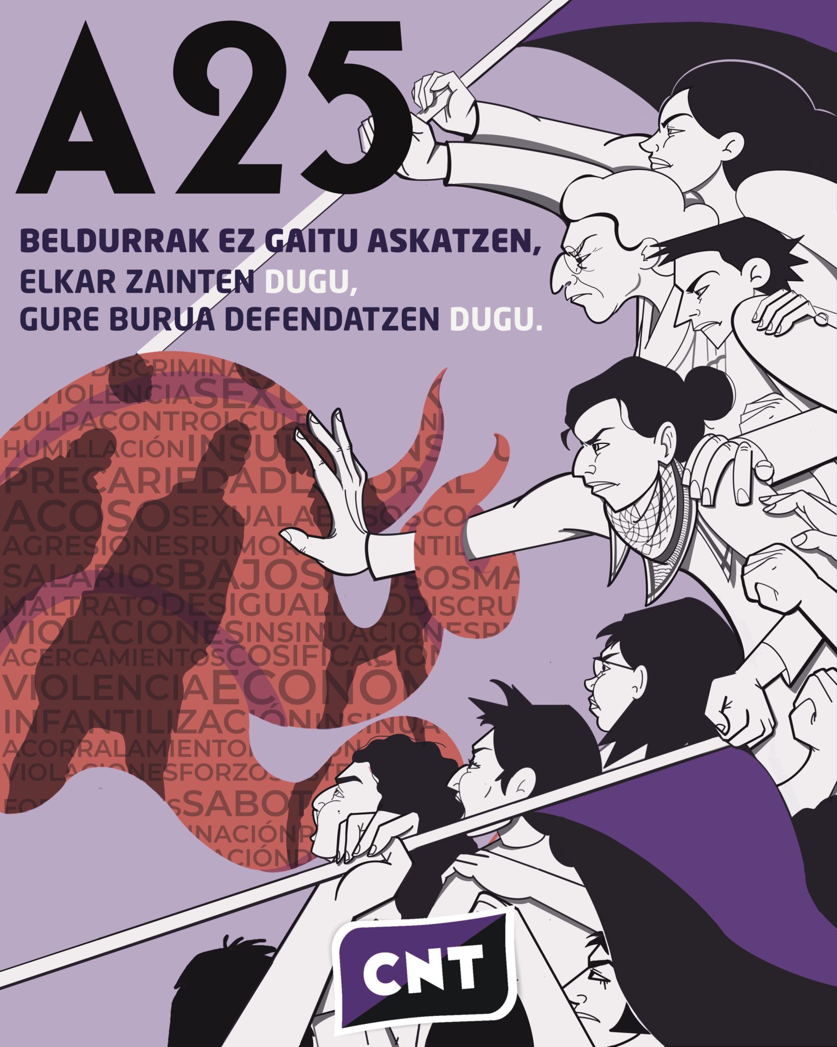 Horregatik guztiagatik, azaroaren 25ean onartzen dugu beldur garela, baina beldurrak ez gaitu salbatzen. Gure beldurrak CNTko gure kideekin antolatutako amorru eta alaitasunari bide eman dio. Gure beldurra aldaketaren eragile bihurtu da, patriarkatuaren eta kapitalaren aurkako erreakzioaren eragile, ito egiten baikaituzte. CNTn badakigu elkarrekin defendatzen garela gupidagabeko lan-merkatu baten oldarkeriaren aurrean, eta elkar zaintzen garela erasotzaile matxistengandik, bai gure guneetatik kanpo, baita barruan ere, emakumeak zaintzen ditugun emakumeak garelako. CNTn amets egiten dugu indarkeria matxistarik gabeko munduak eraikitzen ditugu; izan ere, beldurraren beldurrez, ia ezerk ez gaitu ikaratzen.