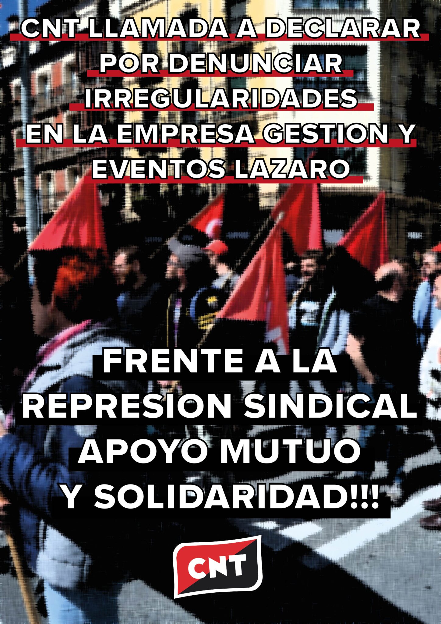 Apirilaren 28an, CNTko militante bat deklaratzera deitu dute, Gestión y Eventos Lázaro enpresak jarritako kereila baten ondoren, Villafrancako udal-igerilekuetako lan-gatazka baten testuinguruan. CNT sindikatuari enpresaburuaren aurkako kalumnia-delitua leporatzen zaio, gatazka horretan sindikatu-lan hutsa egiteagatik.