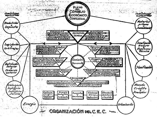 Mariano Cardona Rosell-en proposamena. CEC-ek hainbat eta hainbat enpresa kolektibo antolatzeko balio zuen: lantegi kolektiboak, industria sozializatuak, baratzeak eta soroak, biltegiak, kooperatibak, nekazaritza-sindikatuak edo mugimendu libertarioak kontrolatzen edo bultzatzen zituen era guztietako ekimen ekonomikoak. Ordurako mugimendua potentzia ekonomiko oso bat zen. CECren gai garrantzitsuenak honako hauek ziren: legeria eta arbitrajeak; moneta, kreditua eta aurreikuspena; industria eta zerbitzuen ustiapena; lehengaiak eta ordezkoak; eta banaketa eta kanpo-merkataritza. Gai horietako bakoitzak lan-batzorde bat zuen. Eskualde bakoitzak bere CEC izan beharko luke, eta estatu mailan koordinatuko litzateke.