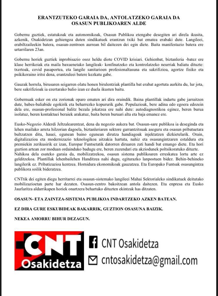 Osakidetzako CNTren sail sindikalak ere, mobilizazioetan aktiboki parte hartu duenak, EAJk osasungintzan duen politika salatu du, lehen mailako arretako eta etengabeko arretako zentroak itxiz eta irekita dauden inbertsioak murriztuz, Osakidetzako langile-politika bezala, kontratazioak saihestuz, profesionaltasunaz eta langileen entregaz etengabe abusatuz, gero eta nekatuago eta desengainatuago baitago.Dei egiten diegu langileei mobilizazio-ildo horretan jarrai dezaten, erabiltzaileengana zabal ditzaten eta, gurekin batera, amaiera eman diezaioten osasun publikoari eta Osakidetzari etengabe eta interesatuta egiten zaion eraso honi.